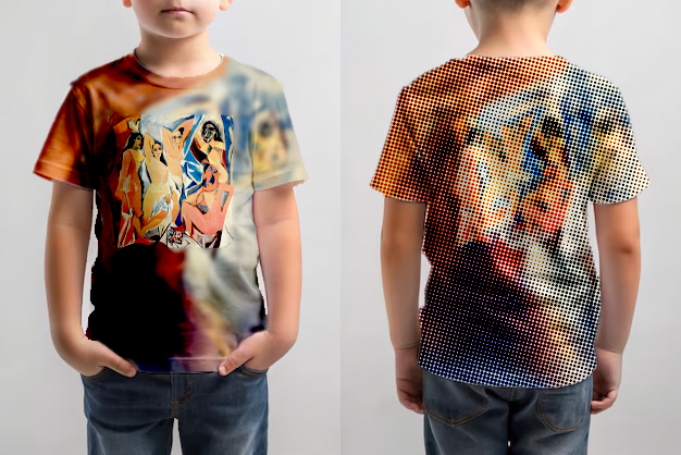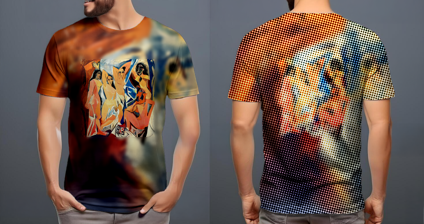 Polera con estampado completo de la obra "Les Demoiselles d'Avignon" de Pablo Picasso. La parte frontal presenta la imagen central de la pintura, mientras que la parte trasera muestra un patrón de puntos que reinterpreta la misma obra. Ideal para agregar un toque artístico y distintivo a cualquier atuendo.