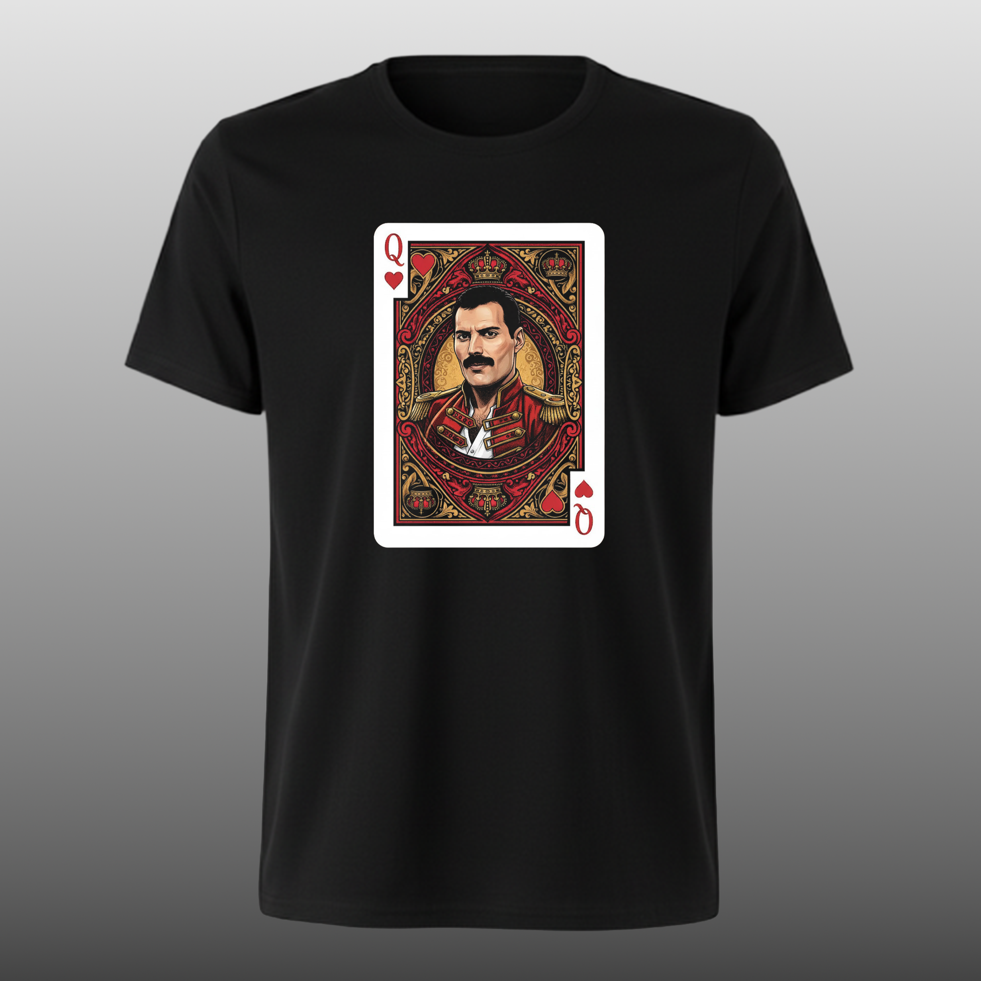 Esta polera rinde un tributo magistral a la realeza del rock a través de Freddie Mercury. El diseño fusiona la iconografía del juego de azar con el legado de Queen, presentando al legendario vocalista como la "Reina de Corazones" en una carta de póker ricamente detallada, vistiendo su icónica chaqueta militar roja.
