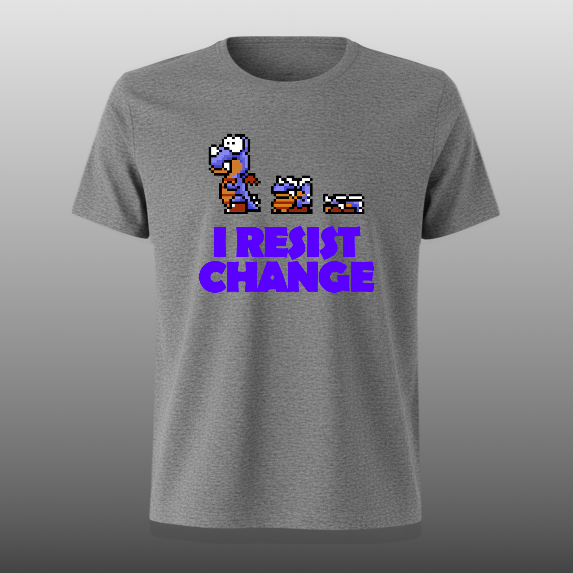 Esta polera es una declaración cómica sobre la inercia personal con el lema "I Resist Change" y una secuencia de pixel art del enemigo Rex. La imagen evoca a la criatura de Super Mario World que se resiste a ser aplastada, desafiando las convenciones con su persistencia. Es el diseño perfecto para quienes abrazan el humor retro y luchan contra la inevitabilidad de la evolución.